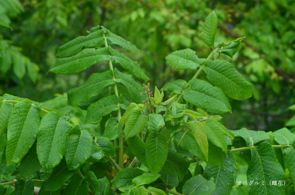 山野の流れに沿って多く生え、栽植もされる高さ20m程になる落葉樹。若枝には黄褐色の軟毛が密生する。葉には柄があり、互生する。葉の下面には星状毛が密に生え、葉の形は9~15個の小葉からなる奇数羽状複葉をしている。雌雄同株。晩春、前年の枝の葉腋から雄花の尾状穂が垂れ下がり、緑色の苞には1個の雄花がある。雌花の穂は新枝の先に直立し、花をまばらにつけ、紅色の花柱が2個ある。核果は球形で、種子は食用になる。