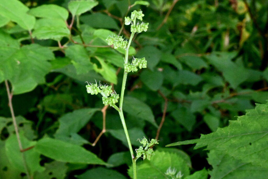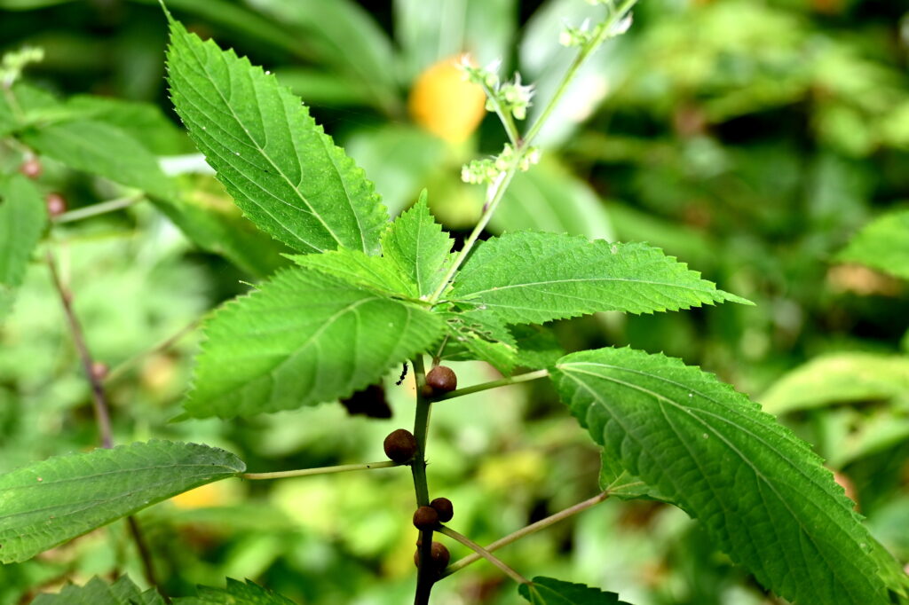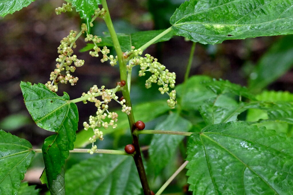 「珠芽刺草(ムカゴイラクサ)」 珠芽(むかご)をつけるイラクサの仲間ということに由来する名前。イラクサの「イラ」は、触ると刺さって痛むことから「イライラする」が転じたという説がある。